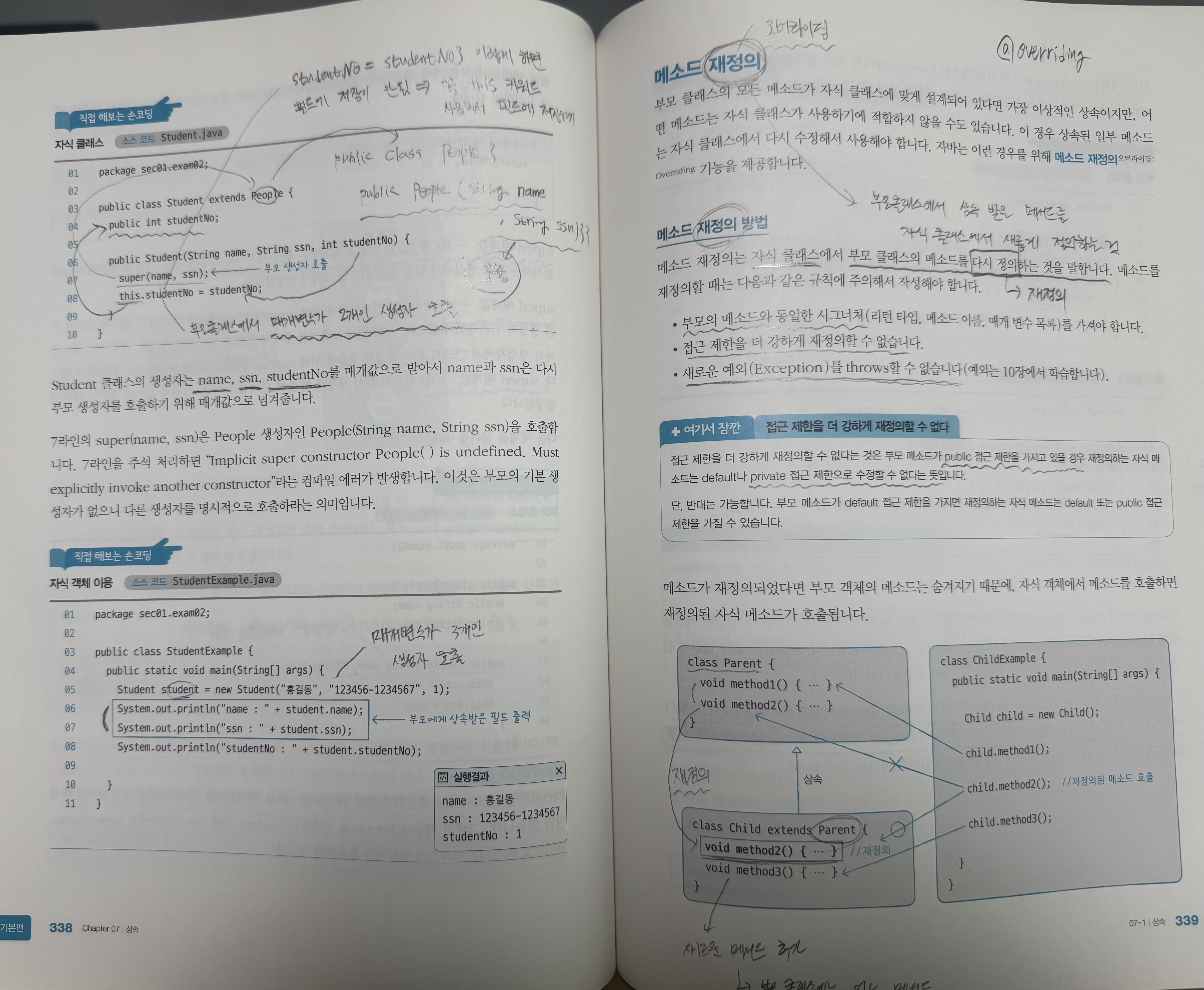 - 자식 클래스가 부모 클래스의 메서드를 다시 정의하는 것.