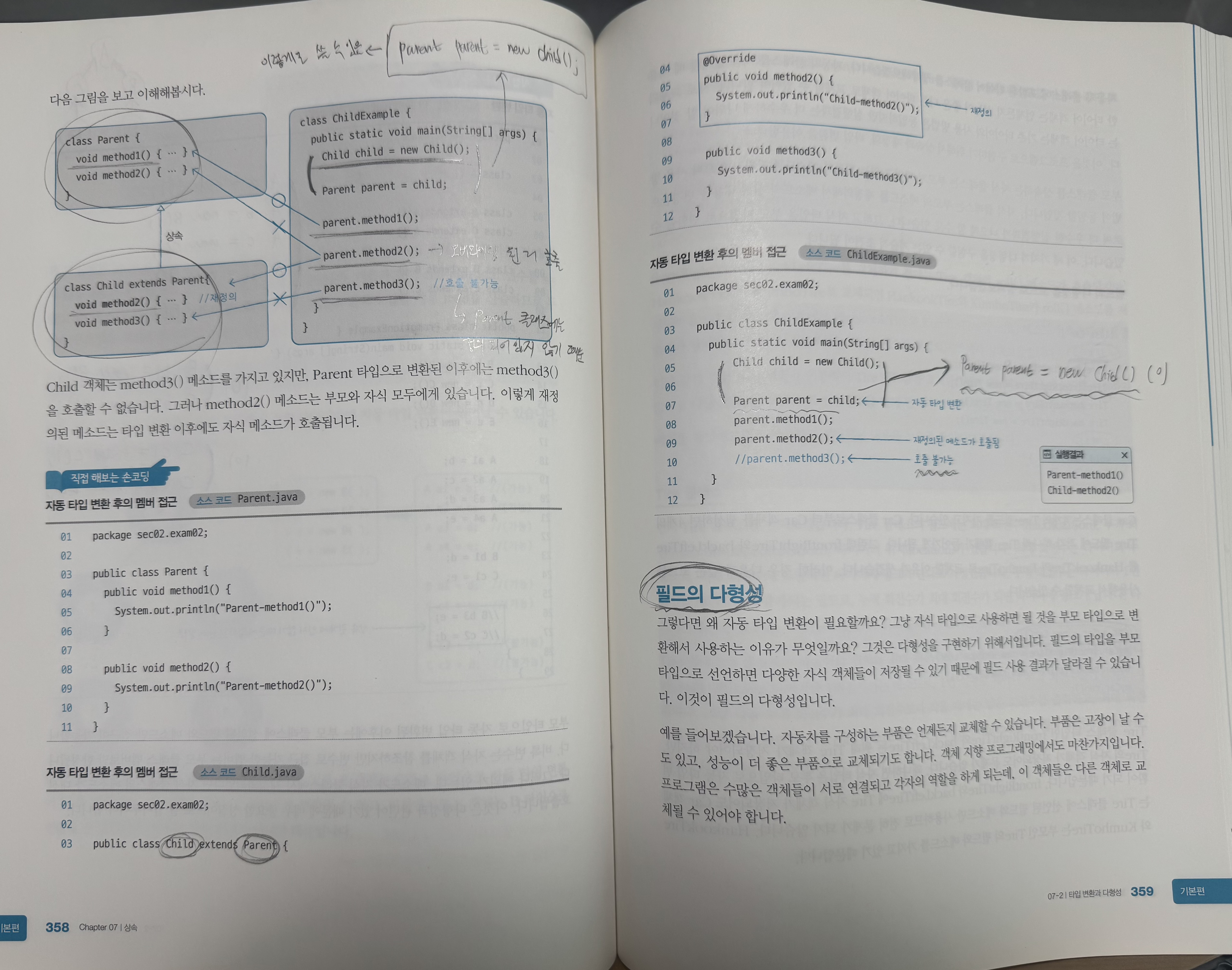 - 메서드는 오버라이딩된 자식 메서드가 호출됨 (다형성의 핵심)