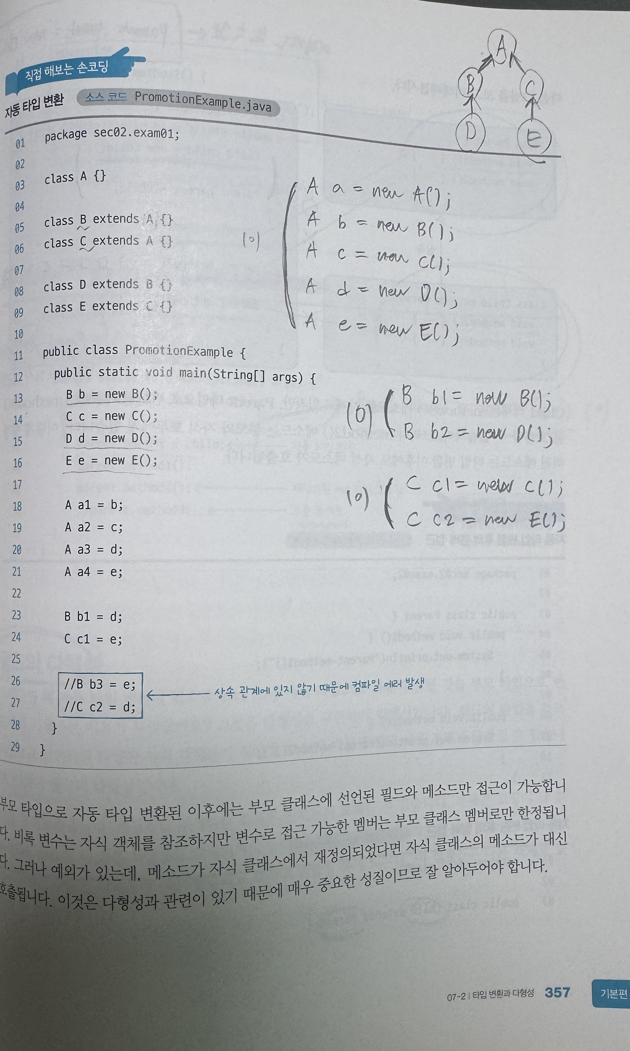 - B b = new E(); (불가능: 상속 관계 X)