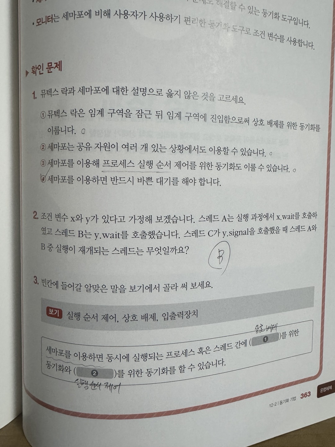 - 프로세스 동기화 : 프로세스들 사이의 수행 시기를 맞추는 것