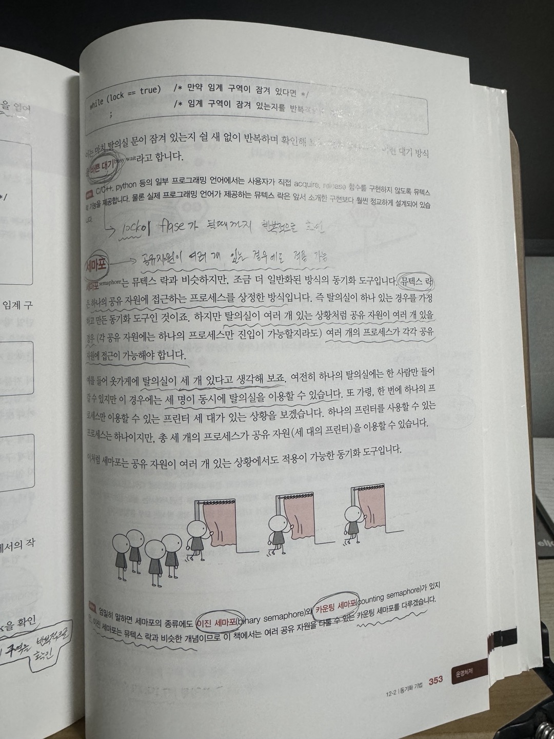 - 세마포 : 공유 자원이 여러 개 있는 임계 구역