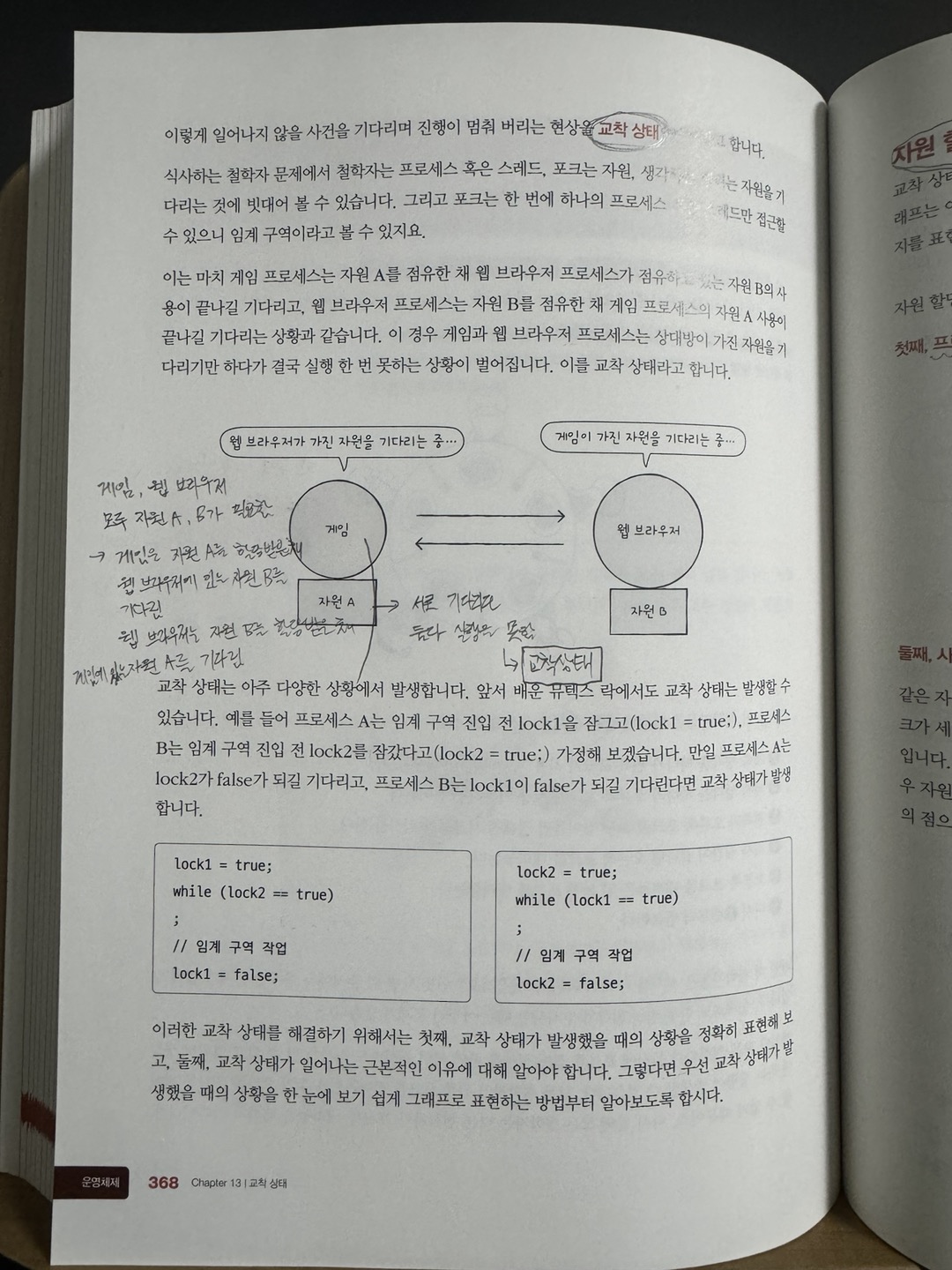 - 교착 상태 : 일어나지 않을 사건을 기다리며 무한히 대기하는 현상