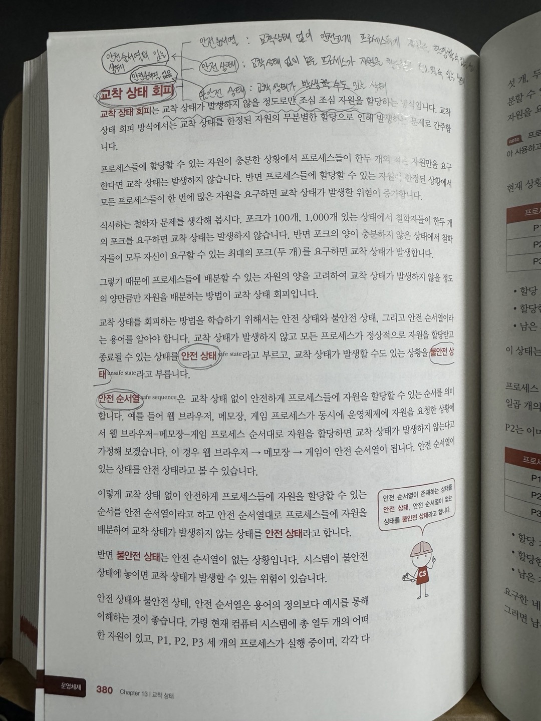 - 안전 순서열 : 교착상태 없이 안전하게 프로세스들에 자원을 할당할 수 있는 순서