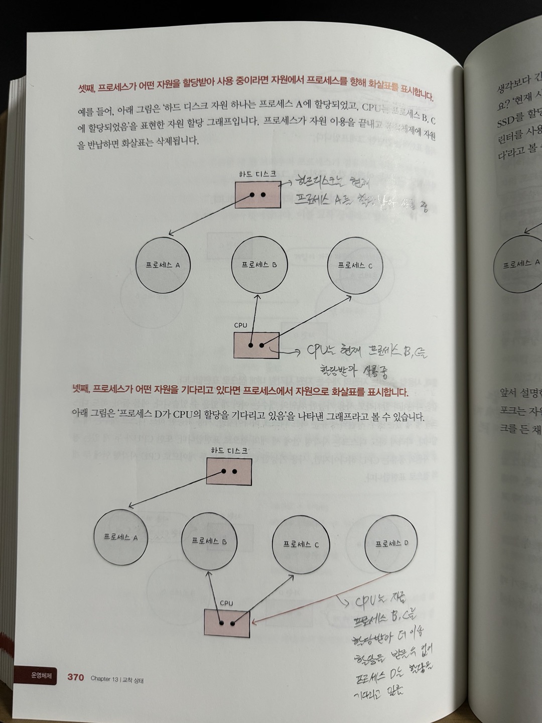 - 프로세스가 어떤 자원을 기다리고 있다면 프로세스에서 자원으로 화살표를 표시