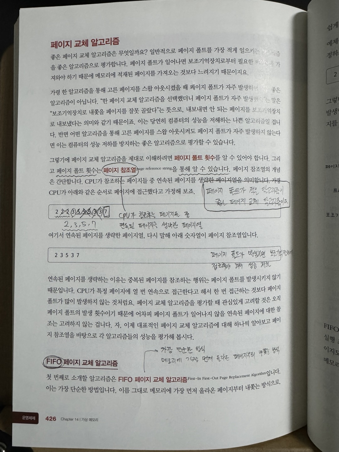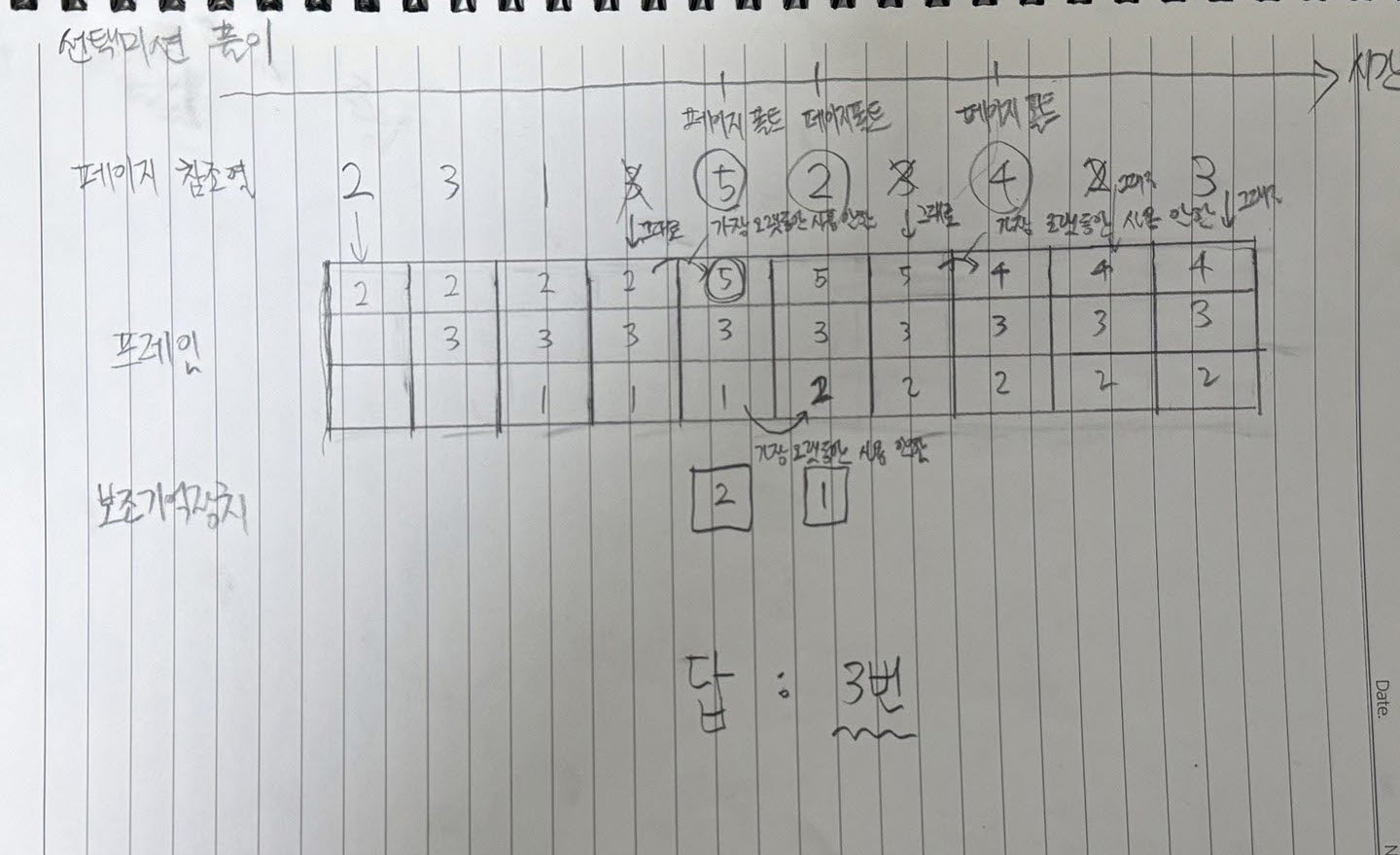 - 최적 페이지 교체 알고리즘 : CPU에 의해 참조되는 횟수를 고려해 메모리에 오래 남아야 할 페이지는 자주 사용될 페이지 메모리에 없어도 될 페이지는 오랫동안 사용되지 않을 페이지로 인식